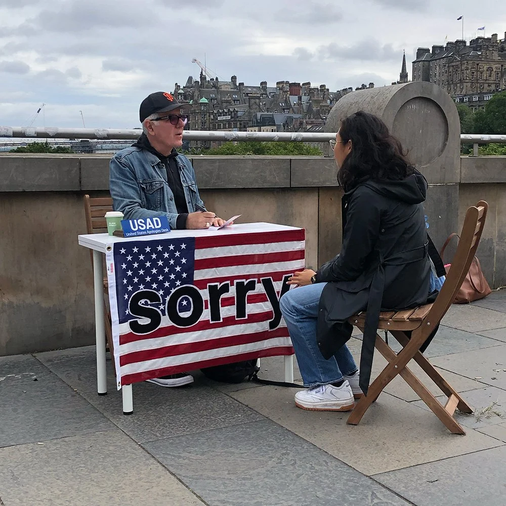 At the heart of the intervention is a simple yet striking setup: a small desk draped with a cotton American flag, altered with hand-sewn woollen letters to read “SORRY.” A placard atop the desk reads “USAD – United States Apologies Desk”, humorously framing the project as an unofficial diplomatic gesture. DeLappe sits behind the desk, with an empty chair opposite him—an open invitation for the public to sit, talk, and engage in honest conversation about the global impact of U.S. policies, leadership, and imperial legacies.